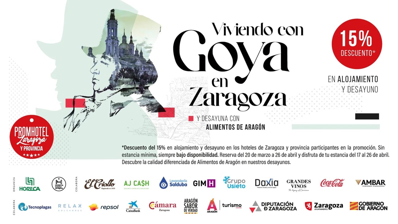 ¡Reserva Zaragoza con un 15% de descuento! Usa el código GOYA en zaragozahoteles.es y ahorra un 15% en alojamiento y desayuno en 20 hoteles de la ciudad y provincia. Promo válida para reservas hasta el 26 de abril y para viajes del 17 al 26 de abril, sin estancia mínima. Es la excusa perfecta para vivir las Fiestas Goyescas (24-26 de abril) y disfrutar de una Zaragoza ambientada en el siglo XVIII con desfiles y videomapping. Además, tu reserva incluye 2x1 en el Bus Turístico y descuentos en museos. |
